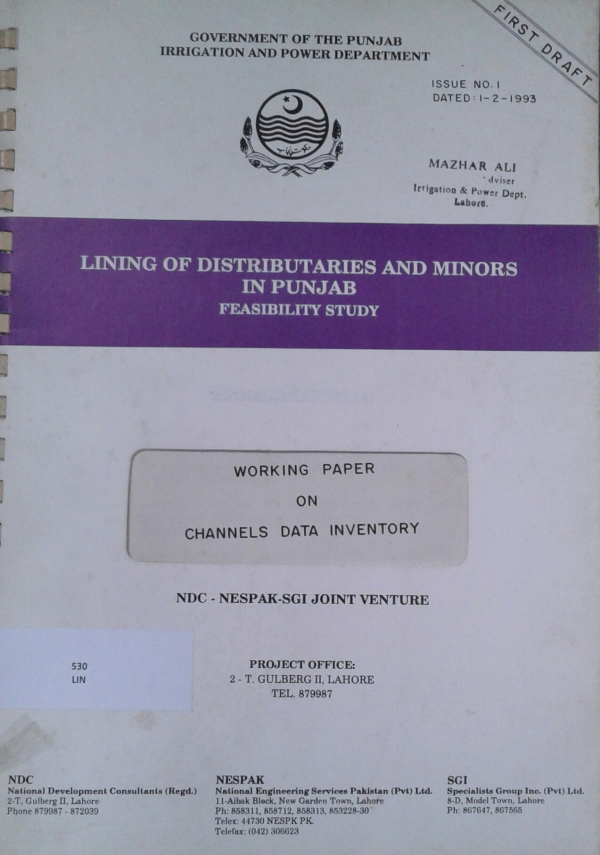 Working paper on channels data inventory: lining of distributaries and minors in punjab feasibility study/ Mazhar Ali