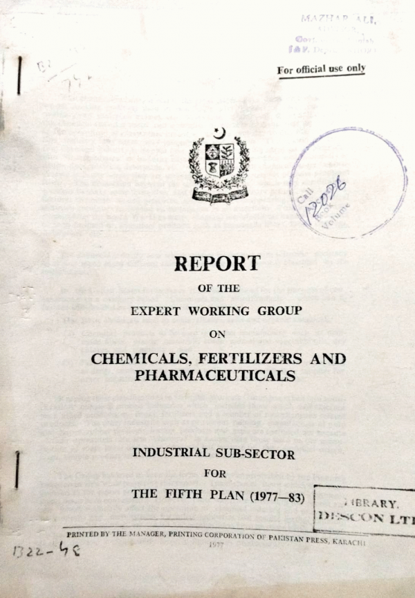 Report of the expert working group on chemicals fertilizers and pharma ceuticals: Insudtrial sub-sector for the fifth plan (1977-83)/ Copporation of pakistan press