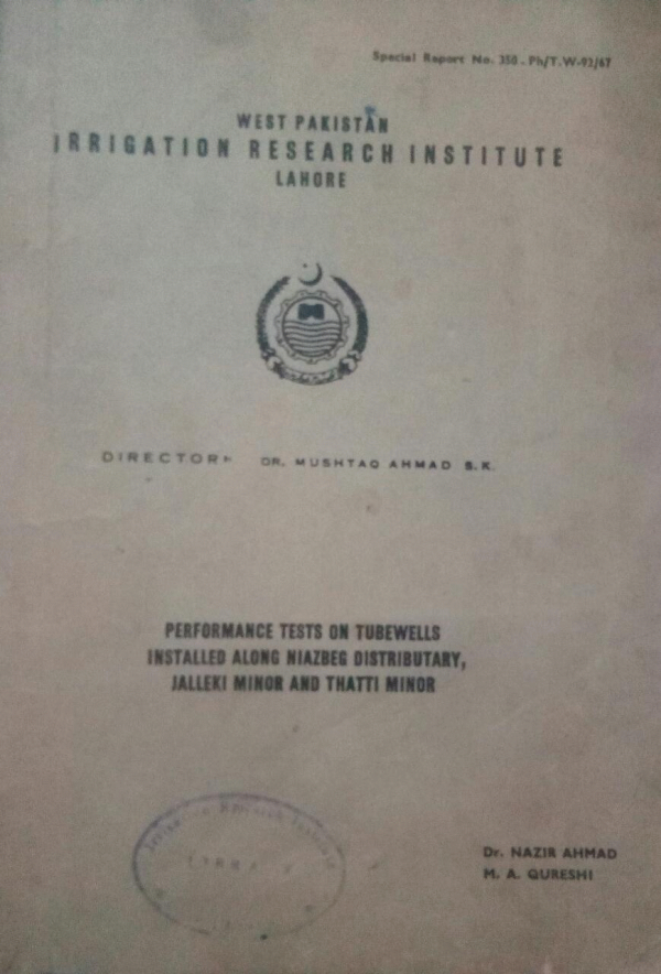 Performance tests on tubewells installed along Niazbeg distributary, Jalleki Minor and Thatti Minor. / Dr. Nazir Ahmad.