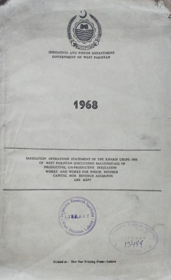 Irrigation operations statement of the kharif crops 1968 of West Pakistan (excluding baluchistan) of productive,un-productive irrigation works and works for which neither capital nor revenue accounts are kept./ Irrigation and Power Department Government of West Pakistan