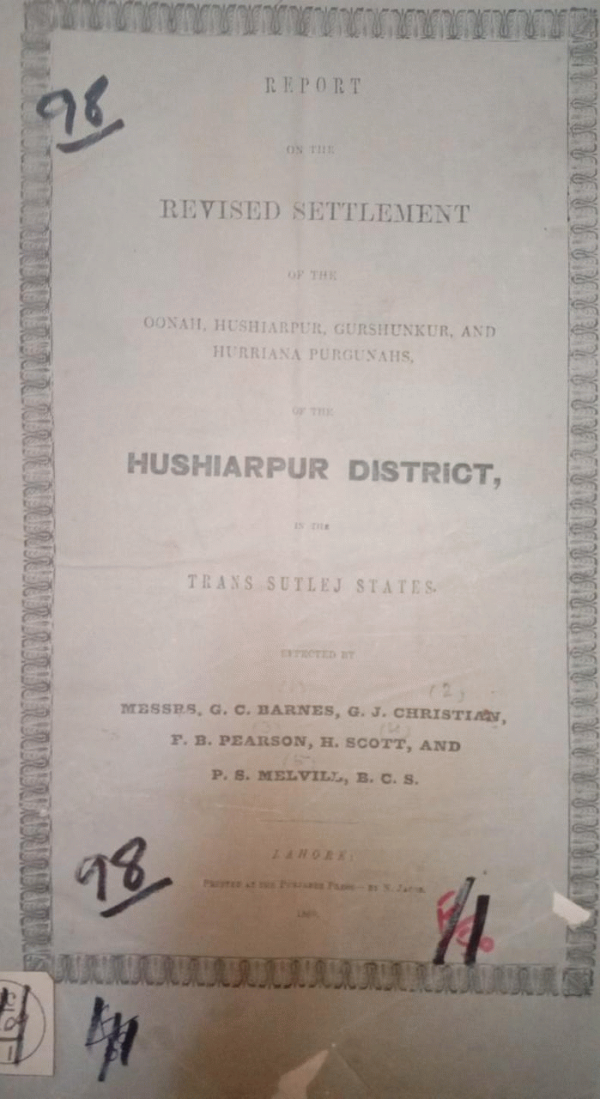 Report on the revised settlement of the Oonah, Hushiapur, Gurshunkur and Hurriana Purgunahs of the Hushiarpur District / Messrs G.C. Barnes and H.Scott