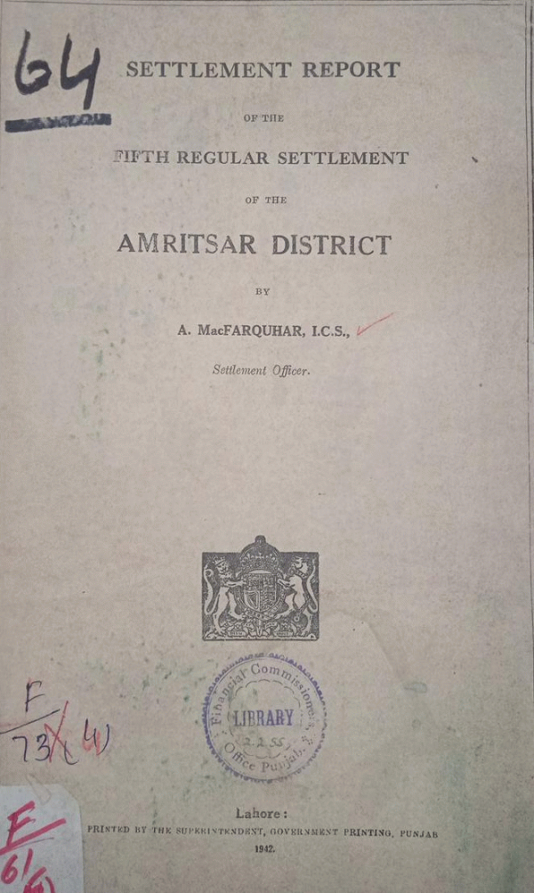 Settlement report of the fifth regular settlement of the Amritsar District / A. Macfarquhar.