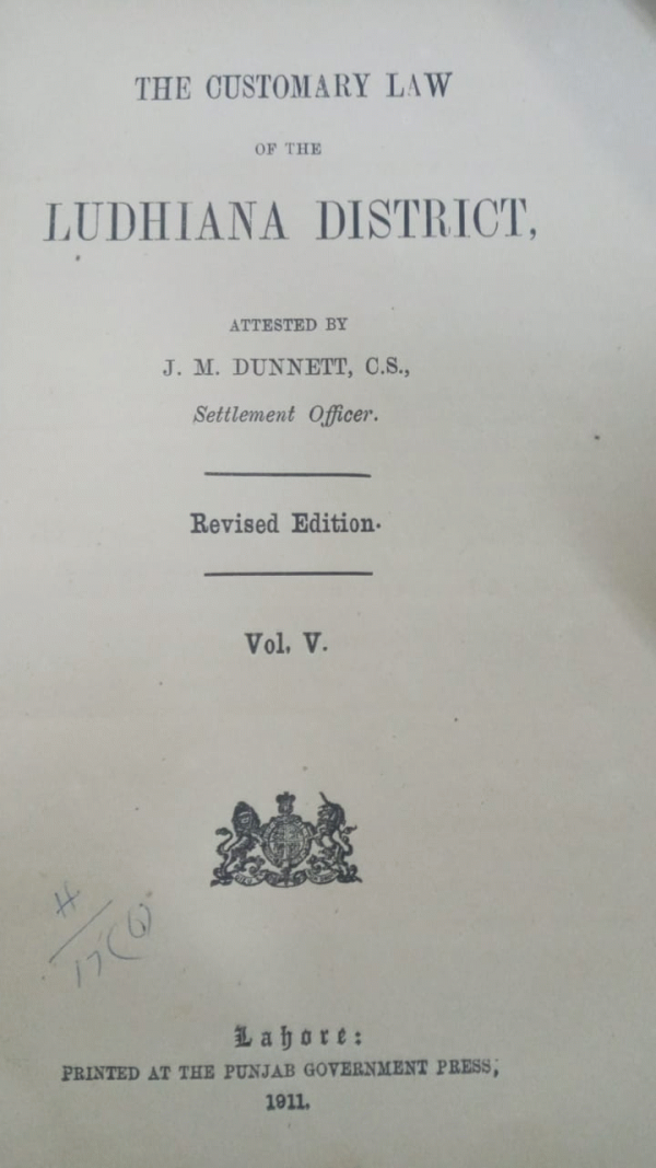 The customary law of the Ludhiana district / J.M. Dunnett.