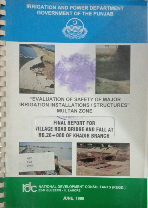 Evaluation of safty of major irrigation installations/ structures in Multan zone. : Final report for village road bridge and fall at RD. 26+080 of Khadir branch. /