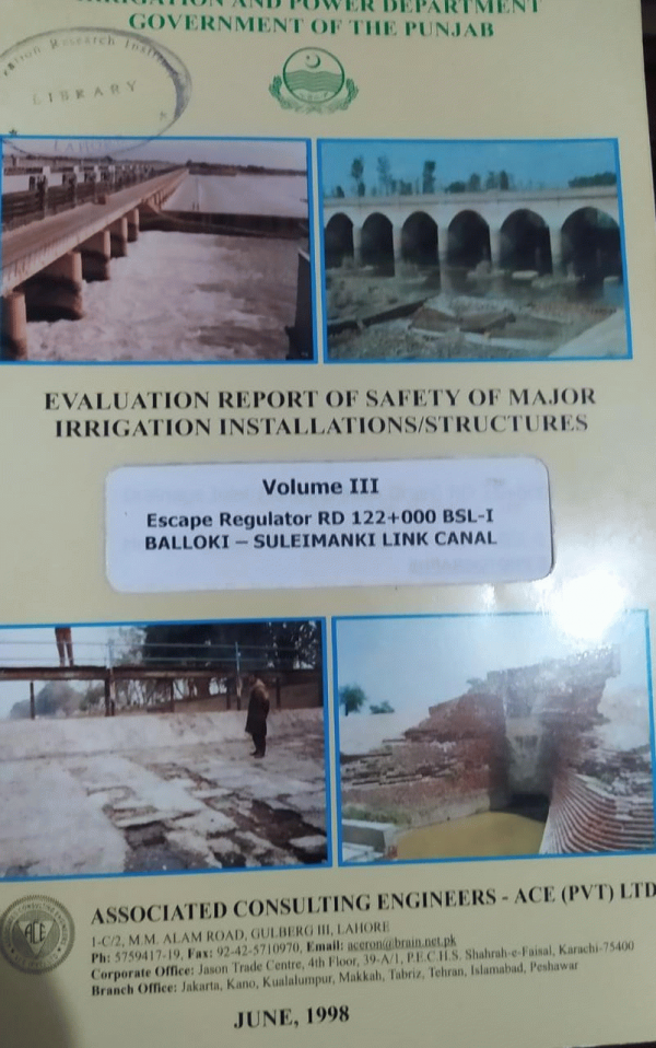 Evaluation report of safety of major irrigation installations/structures : escape regulator RD 122+000 BSL-I Balloki-Suleimanki link canal / Irrigation and power department, Government of punjab by