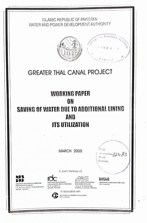 Greater thal canal project: Working paper on saving of water due to additional lining and its utilization/