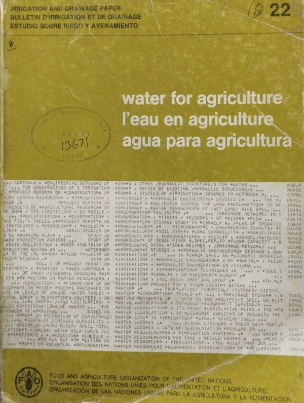 Water for agriculture : annotated bibliography = L'eau en agriculture : bibliographie annotee = Agua para agricultura : bibliografia anotada. / Food and Agriculture Organization of the United Nations. by Series: ; Irrigation and drainage paper, 22