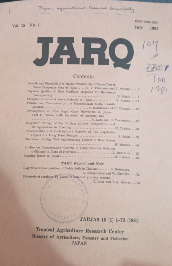 Publication details: Japan: Tropical Agriculture Research Center, Ministry of Agriculture and Forestry July, 1981