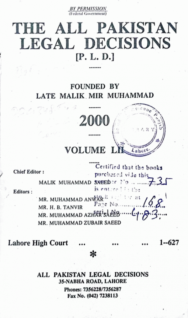 The all pakistan legal decisions (PLD) 2 : 2000 / Malik Meer Muhammad and edited by Muhammad Anwar Khokhar, Muhamad Azhar Saeed & Muhammad Zubair Saeed by Series: ; Vol. lii