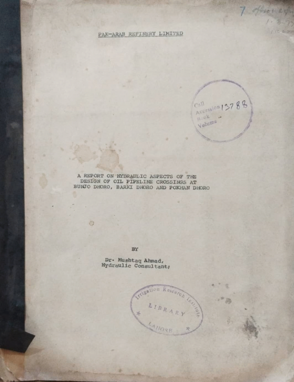 A report on hydraulic aspects of the desaign of oil pipeline crossings at Bunjo dhoro, barki dhoro and pokhan dhoro. / Dr. Mushtaq Ahmad. by Series: PAK-ARB REFINERY LIMITED