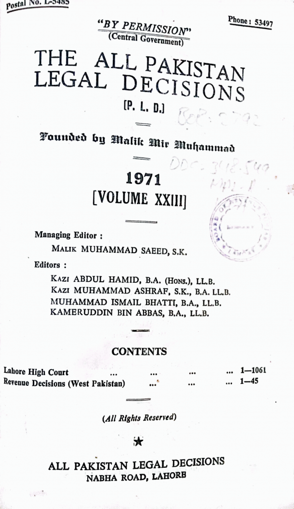 The all Pakistan legal decisions (PLD) : 1971 / Malik Meer Muhammad and edited by Malik Muhammad Saeed & Muhammad Ismail Bhatti by Series: ; vol.xxiii
